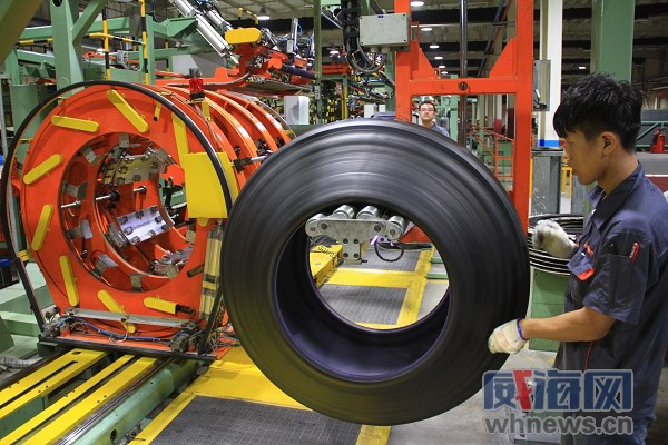 8月9日,位于臨港區(qū)的威海君樂(lè)輪胎有限公司車(chē)間內(nèi),工作人員正在使用三鼓成型機(jī)進(jìn)行輪胎生產(chǎn)。